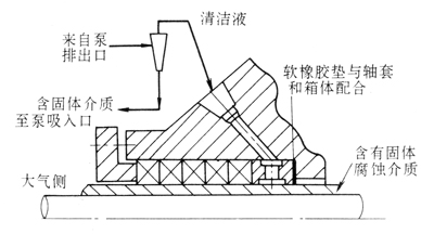 ④輸送含有固體磨蝕介質(zhì),如砂漿水、污水時(shí),為了提高填料、軸或軸套的使用壽命,減少磨蝕,需在封液處通入清潔液體。清潔液可從外部供給,外部密封液壓力應(yīng)大于填料室內(nèi)側(cè)壓力70-172kPa,但為了減少被密封介質(zhì)的稀釋,在封液環(huán)與填料室里端之間需設(shè)置兩圈填料;也可以從泵的排出El引出液體,經(jīng)過(guò)過(guò)濾器或離心分離器后通入封液環(huán)。封液環(huán)與軸肩之間有橡膠墊,以防清潔液和泥漿水流動(dòng),詳見(jiàn)圖1—30所示。橡膠墊需與填料箱內(nèi)徑、軸或軸套外徑相配合。