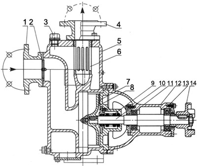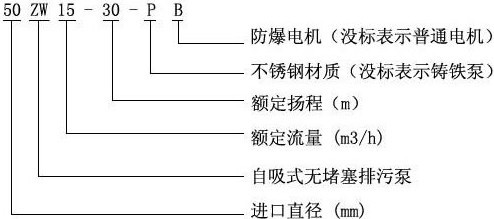 ZW型無堵塞自吸排污泵為單級單吸臥式,吸入口為軸向吸入,排出口為垂直向上,自吸入口向電機(jī)端看為順時針方向旋轉(zhuǎn)。